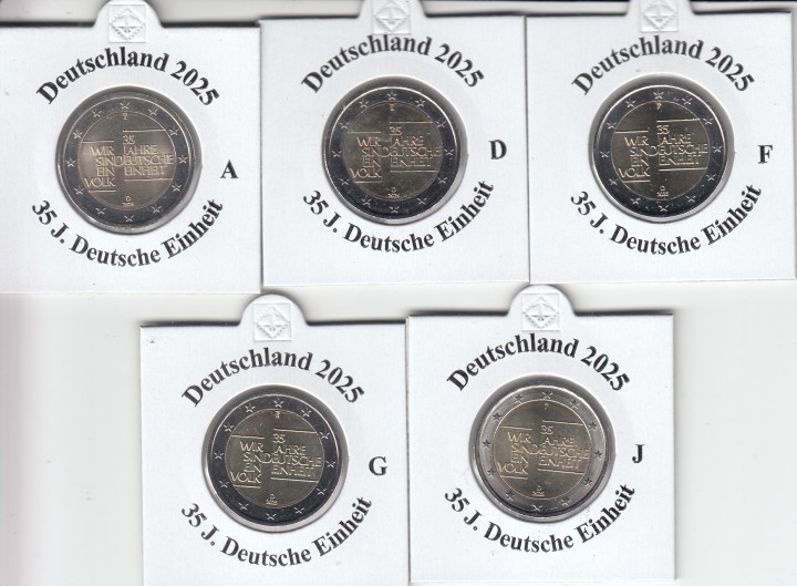Deutschland 2 Euro 2025 Deutsche Einheit, bankfrisch aus der Rolle, A - J kpl.
